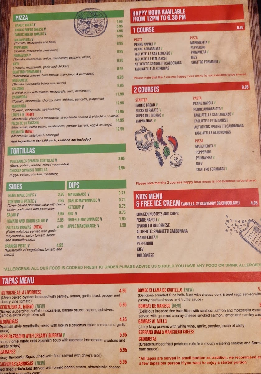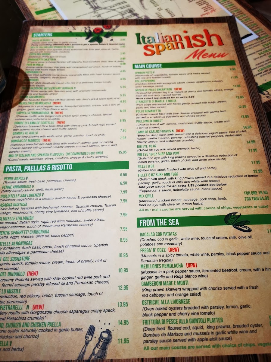 Highlights like the Pizza Kiev, Lamb De Carlos Fonzos, and Mussels invite diners to enjoy something a little different, while classic tapas such as Bruschetta and Albondigas keep the menu familiar and approachable. For those lingering a little longer, the drink options including a refreshing Sangria or a Limoncello Mojito complement the mood perfectly, making any visit a pleasant pause in the day.